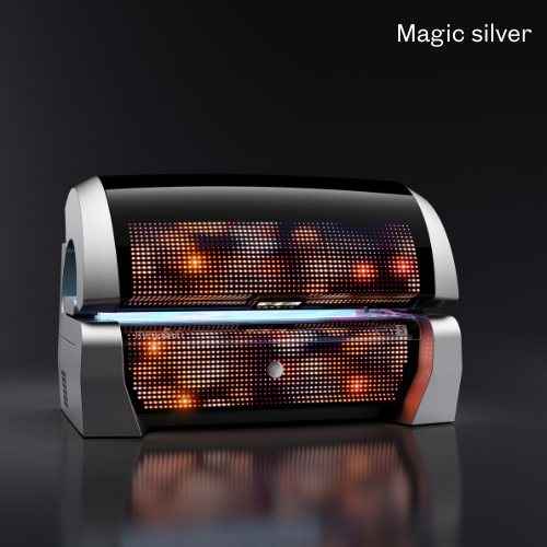 Striking Optics - Solarium design in the footsteps of the legendary Porsche 911. The ‘Magic Silver’ chassis colour fascinates with a variety of selectable light show programmes.